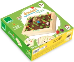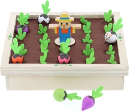 Fedezzétek fel a kiskert varázsát a családi asztalnál. Ez a gyönyörű fa játék filc elemekkel színes zöldségfigurákat és receptkártyákat kínál, amelyek segítségével a gyerekek megtanulják felismerni az alakokat, színeket és a logikai összefüggéseket. Játsszatok klasszikus memóriát, vagy főzzetek együtt levest a receptek szerint – mindig egy kis izgalommal, vajon felbukkan-e a csintalan nyuszi.
