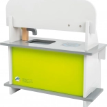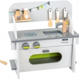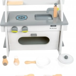 Kompakt gyerek konyha FSC tanúsított fából, amely mindent kínál a valósághű főzőjátékhoz: sütő mágneses ajtóval, forgatható, kattogó gombok és bőséges tartozékok, köztük fedeles fazék, sószóró és borsszóró. Okos kialakításának köszönhetően szerszám nélkül összeszerelhető és szétszedhető.
