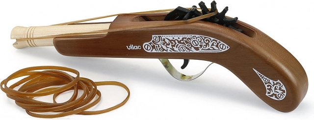 Fa kalózpisztoly a Vilac márkától ideális játék a kalóz kalandokat kedvelő gyerekek számára. Lehetővé teszi a gyerekek számára, hogy célba lövést gyakoroljanak biztonságos gumiszalagokkal, amelyek a csomag részét képezik.