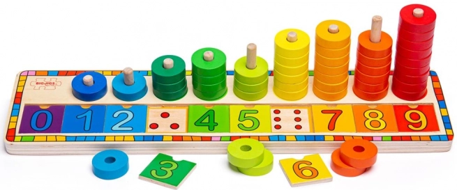 A 0–9-es számsorok és a rakosgatható gyűrűk segítik a gyerekeket a mennyiség, a sorrend és az alapvető számolás természetes megértésében.
