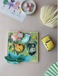 Michelle Carlslund finom pasztellszínekkel készült dizájnja vonzó megjelenést kölcsönöz a játéknak és ösztönzi a képzeletet. A kivágásokkal és állatmotívumokkal ellátott fa alap segíti a formák párosítását, a színek és az állatok felismerését. A kirakó tartós, biztonságos, minőségi fából és textilből készült.