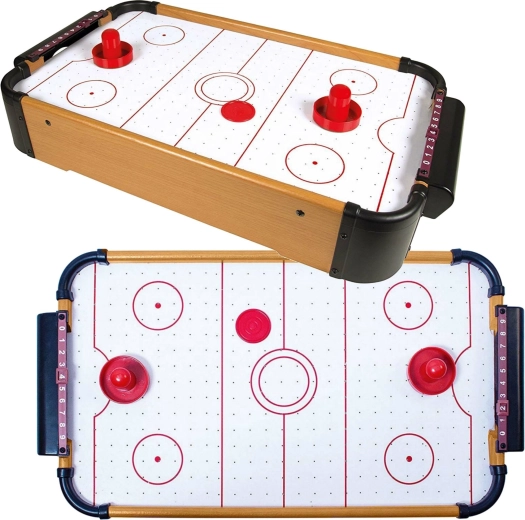 Ez az asztali air hockey két játékos számára nyújt szórakozást praktikus, utazó méretben. A perforált pálya és a levegőáram miatt a korong lebeg és rendkívül gyorsan mozog – ideális gyors meccsekhez otthon, a nyaralóban vagy barátoknál.