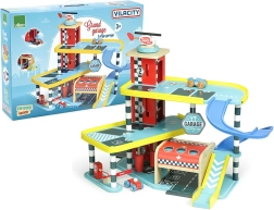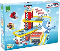 A nagy VILAC Vilacity fa garázs tökéletes városi közlekedési központ minden kis versenyző számára. Az átgondolt mechanikus részleteknek, mint a működő lift, a sorompó és az autómosó köszönhetően a gyerekek fejlesztik a finommotorikát, a fantáziát és a logikus gondolkodást. A készlet két kisautót és egy helikoptert tartalmaz, így azonnal kezdődhet a játék az összeszerelés után.