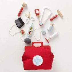 A LE TOY VAN Honeybake kollekciójának ez a dizájnos orvosi táskája kiváló alap a szerepjátékhoz. A vintage textil táska merev aljjal és fa fogantyúkkal 10 gondosan kidolgozott kiegészítőt rejt, amelyekkel a gyerekek valódi orvosi vizsgálatokat utánozhatnak. A még élethűbb élmény érdekében nyomtatható „orvosi recept” kártyák is tartoznak hozzá.