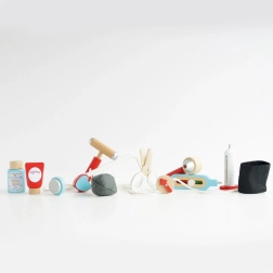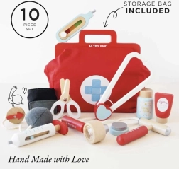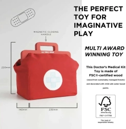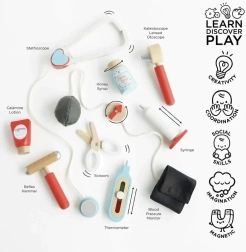 Stílusos orvosi készlet kis doktoroknak és doktornőknek textil táskában, fa fogantyúkkal, amely mindent tartalmaz a rendelős szerepjátékhoz. Összesen 10 elemet foglal magában, többek között sztetoszkópot, hőmérőt és injekciós fecskendőt. A játék gendersemleges, fejleszti a finommotorikát, a képzelőerőt és a kognitív készségeket. FSC tanúsítvánnyal rendelkező fenntartható fából készült, kézzel utófestve vízbázisú, nem mérgező festékekkel.