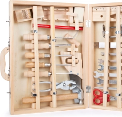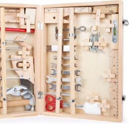 A bőröndben mindent megtalálsz, ami a kisebb otthoni projektekhez és a mesterségek játékos felfedezéséhez szükséges: villáskulcsok, csavarhúzók, fűrész, olló, véső, ács ceruza, imbuszkulcs, kalapács és további kiegészítők. A 48 darabos készlet fejleszti a finommotorikát, a koncentrációt és a kreativitást.