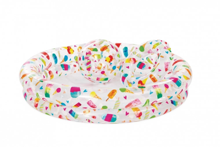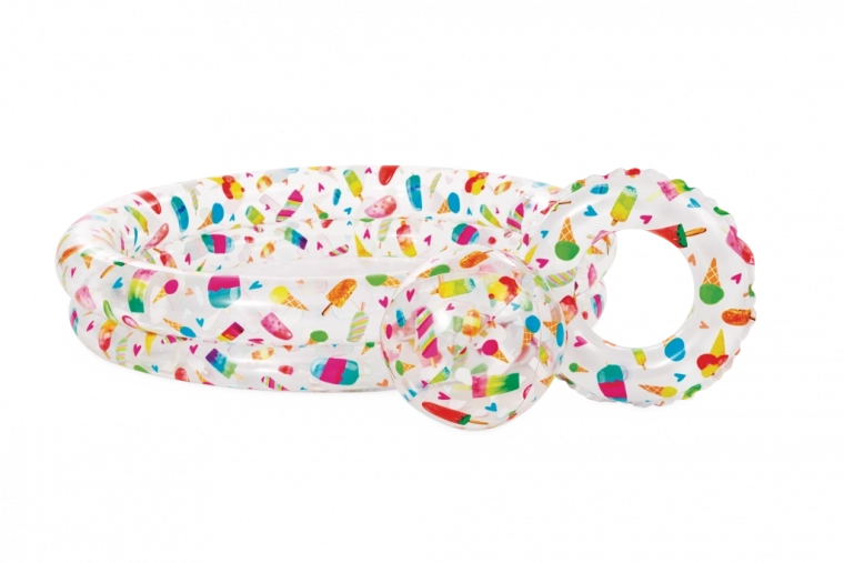 A készlet tartalmaz felfújható medencét, úszógumit és strandlabdát – a gyerekek pancsolhatnak, labdázhatnak és magabiztosabban mozoghatnak a vízben.