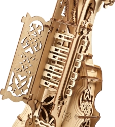 292 precízen, lézerrel vágott rétegeltlemez-elem illeszkedik egymásba ragasztó nélkül. A díszes ornamentikák és a látható fogaskerekek látványos dekorációvá teszik.