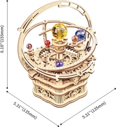 Fedezze fel a Naprendszer mozgó modelljének varázsát: a ROKR 3D fa kirakó Csillagos éj egy elegáns, mechanikus planetárium zenélő dobozzal. A Memory (CATS) dallam lejátszásakor a színes bolygók a „Nap” körül természetesen forognak. A hársfából készült rétegelt lemezből lézerrel kivágott elemek precíz kidolgozást biztosítanak, az építés fejleszti a műszaki gondolkodást, a türelmet és a finommotorikát. Remek oktató és dekoratív kiegészítő a belső térbe, valamint különleges ajándék gyerekeknek és felnőtteknek egyaránt.