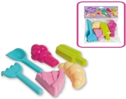 Szórakoztató homokozó készlet kis cukrászoknak. Ezekkel a formákkal a gyerekek készíthetnek tortácskát, jégkrémet, gombócos fagyit és további finomságokat. A könnyű formázáshoz lapát és gereblye is tartozik. Könnyű műanyag, egyszerű kezelés és színes mix garantálják az órákig tartó kreatív játékot játszótéren és a strandon is.