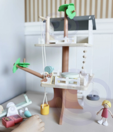 A csomag 31 elemet tartalmaz, köztük 2 gyerekfigurát, 2 állatkát és kiegészítőket, mint a hinta, a gumiabroncs-hinta, az egyensúlyozó hinta, ágy, asztal, szék és kincsesláda. A gondosan megmunkált természetes fa finom színekkel tartós és kellemes tapintású.