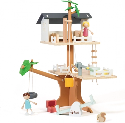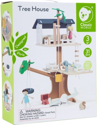 Fedezd fel a varázslatos fa fára épített babaházat a Classic World márkától, amely 31 elemmel kínál végtelen jeleneteket és szerepjátékot. A gyerekek imádni fogják a működő csigát vödörrel, a hintákat, a létrát és a bájos figurákat az állatkákkal. A minőségi természetes fa és a sima megmunkálás biztonságos és kreatív játékot biztosít 3 éves kortól.