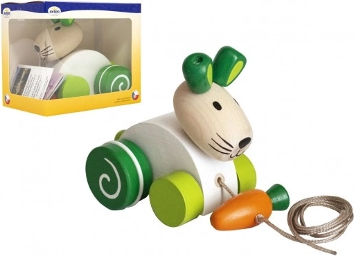 Ez a fa, húzható nyuszi sétára és aktív mozgásra ösztönzi a gyerekeket. Sima felületének és masszív kialakításának köszönhetően a játék biztonságos és kellemes tapintású. A zsinórra erősített répa vidám elemmel gazdagítja a játékot, és fejleszti a gyermeki fantáziát.