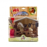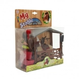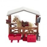 A csomagban istálló és kiegészítők találhatók, mint vödör, seprű, villa, lapát és felszereléses kis bőrönd – minden az autentikus farmjelenetekhez.