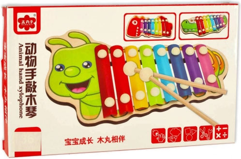 A xilofon fa és fém kombinációjából készült. Elég finoman megütni az ütővel a lapot, és tiszta hang szólal meg, amelynek hangerőssége az ütés erejétől függ. A élénk, meleg színek játékra csábítanak, és remekek a színek tanulásához is.