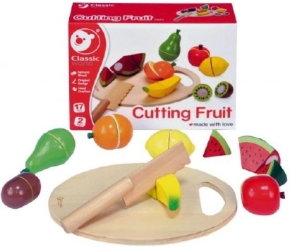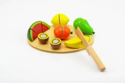 Egy fantasztikus játékkészlet, amely segítségével a gyerekek eljátszhatják a gyümölcsvágás folyamatát. A csomag 17 darabot tartalmaz, amelyeket egy fa kést használva lehet elvágni, majd a tépőzár segítségével újra összerakni. Ideális olyan gyerekek számára, akik 2 évesek vagy idősebbek.