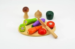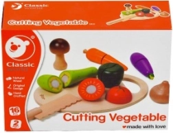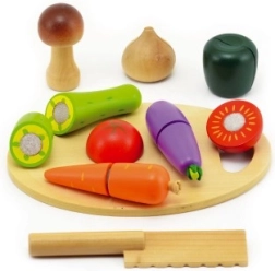 Ez a fa szeletelő készlet tökéletes játék kis szakácsok számára. 16 valósághű zöldségdarabot tartalmaz, amelyeket a gyerekek fa késsel és vágódeszkával vághatnak.