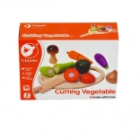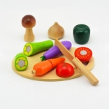 Zöldségszeletelő készlet gyerekeknek, amely 16 fa részből áll, ideális a motoros készségek fejlesztéséhez. Az egyes gyümölcsdarabok tépőzárral vannak összekapcsolva.