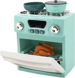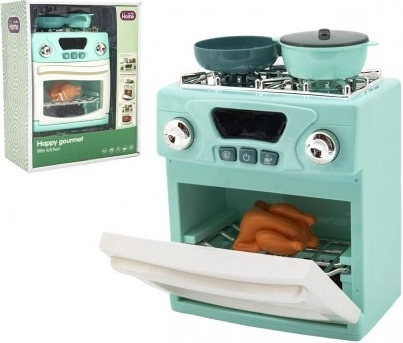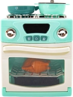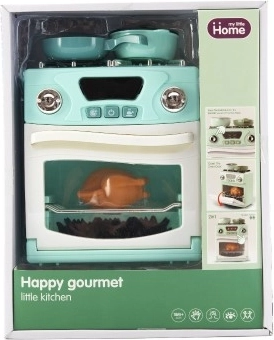 A készlet része egy tűzhely, sütő, két lábas és sült csirke a teljesebb játékélmény érdekében.