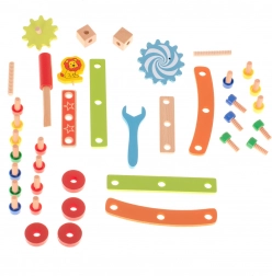 A csomag része egy fa csavarhúzó és egy kulcs, így a kis építők mindent megkapnak, amire szükségük van. A színes elemek játékos motívumokkal (pl. oroszlánka és fogaskerekek) támogatják a kreatív játékot és segítenek a színek felismerésében. Remek ötlet fejlesztő játéknak és ajándéknak is, amely órákra leköti a gyerekeket.
