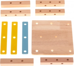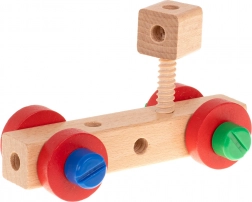 A csomagban fa csavarhúzó, kulcs, csavarok és anyák találhatók – a gyerekek megtanulják helyesen összekapcsolni az elemeket, és fejlesztik a finommotorikát.