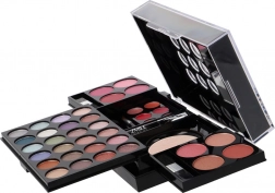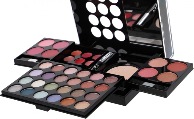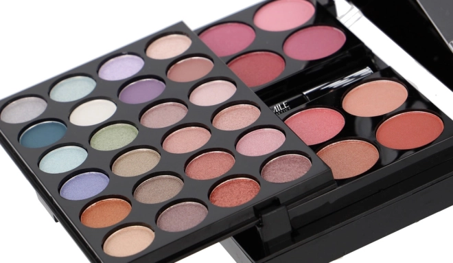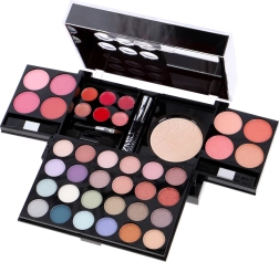 - 24× szemhéjpúder, 8× pirosító, 6× krémes ajakfény, 1× púder, 1× szempillaspirál, 1× 4 darabos applikátor/ecset készlet, beépített tükör