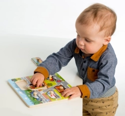Minden a hat beillesztő képből egy-egy másik közlekedési eszközt képvisel, így például rendőrautót, buszt, mentőautót, tűzoltóautót, kukásautót és személyautót. Az összerakás könnyen megoldható a fa alapnak és a fogantyúknak köszönhetően, ami egyszerűvé teszi a kicsi kezek számára a darabok mozgatását.