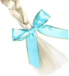 Az elegáns, szőke copf világoskék szalaggal és virágokkal átszőve finomságot és mesés bájt kölcsönöz a jelmeznek.
