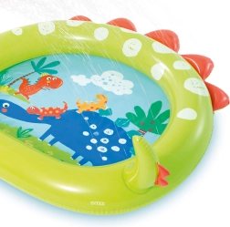 Vidám felfújható medence szökőkúttal és dinoszaurusz mintával, ideális nyári szórakozáshoz a kertben. A medence kiváló minőségű PVC anyagból készült, méretei 119 x 109 x 66 cm.