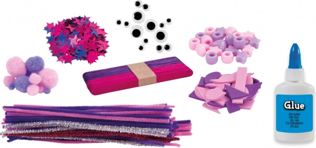 Zseníliadrótok, pomponok, hab formák, gyöngyök, öntapadós szemek, valamint csillámos és klasszikus ragasztó – számtalan kézműves projekthez ideális kombináció.