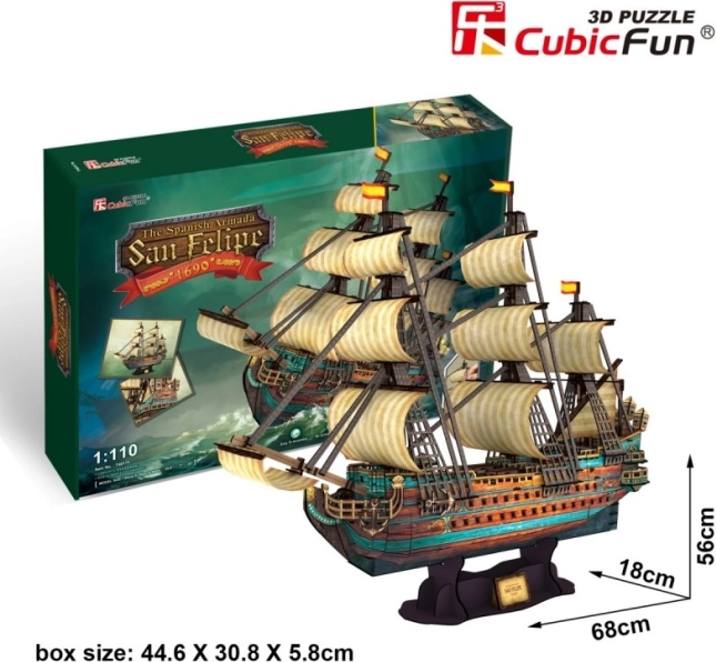 A CubicFun San Felipe 3D puzzle élethű, gazdagon díszített történelmi gályamodellt kínál átgondolt fedélzeti részletekkel. A kb. 3 mm vastag habból, laminált nyomtatott papírral bevont elemek pontosan illeszkednek egymáshoz, és stabil és látványos végeredményt biztosítanak ragasztó vagy olló használata nélkül.