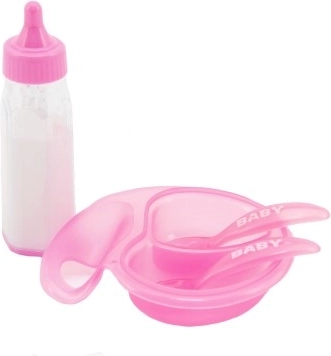 Ez a babaápoló készlet ideális kiegészítő minden kis gondozónak. Készíts ízletes ételeket a tálkába és szolgálj fel babádnak a mellékelt kanál és villa segítségével. Figyeld, ahogy a tej a cumisüvegben 'eltűnik', amikor megitatod a babát, és újra megjelenik, amikor megfordítod az üveget. Ez a készlet órákig tartó szórakozást nyújt és elősegíti a finommotorika fejlesztését és a gondoskodást másokról.