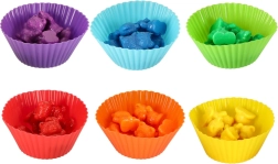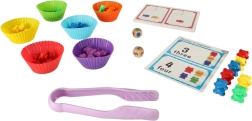 Ez a sokszínű készlet összekapcsolja a tanulást és a játékot. A gyerekek számolhatnak, összehasonlíthatnak és színeket párosíthatnak, egyszerű feladatokat oldhatnak meg és gyakorolhatják a koncentrációt. A szilikon poharak segítik a válogatást, a fa kockák és a munkakártyák pedig tucatnyi tevékenységet kínálnak önálló és közös játékhoz.