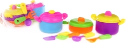 Ez a színes edénykészlet mindent kínál a gyerekeknek, amire a főzés világának felfedezéséhez szükségük van. Valósághű formáival és méreteivel támogatja a szerepjátékot, a finommotorikát és a kreativitást. Minden a könnyű hálóban kap helyet, ami megkönnyíti a hordozást és a tárolást.