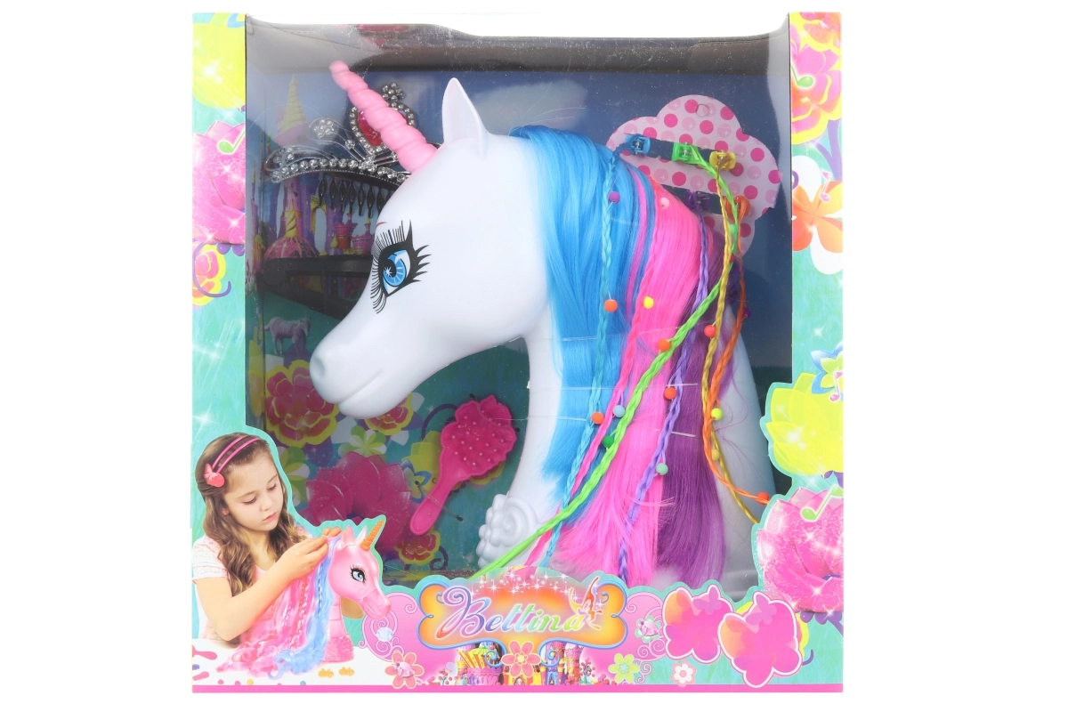 Fésülhető egyszarvú fej kb. 22 x 27 cm méretben. A csomag tartalmaz fésűt, koronát és 6 színes copfot. A csomag mérete kb. 30,5 x 32 x 14 cm. Ajánlott életkor: 3+