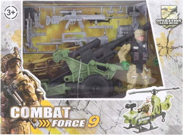 Katonai készlet ágyúval 3+ éves gyerekeknek. Katonafigurát és kiegészítőket tartalmaz, fejleszti a fantáziát és a motorikát. Kompakt csomagméret: 23 × 17 × 6,5 cm.