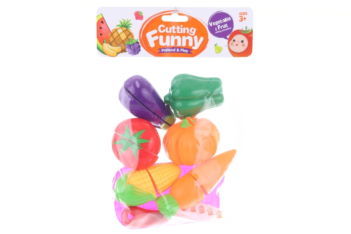 Szórakoztató műanyag zöldségszeletelő készlet kis szakácsoknak. Az egyes darabok belül tépőzárral kapcsolódnak, így újra és újra felvághatók és összekapcsolhatók. Remek játék a finommotorika fejlesztésére és az élelmiszerekkel való ismerkedésre. A csomagban összesen 14 darab található.