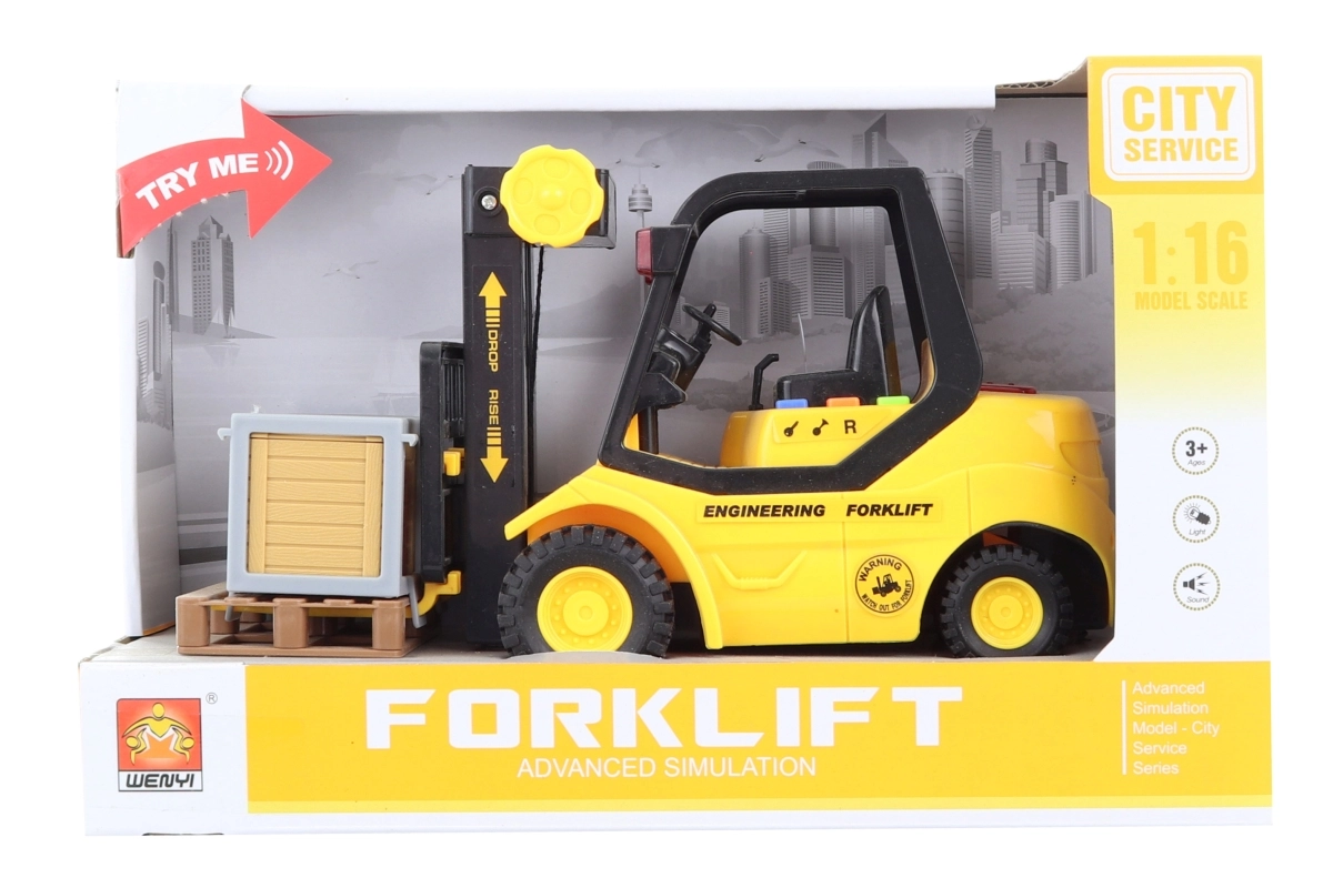 Szórakoztató és élethű elemes targonca 1:16 méretarányban, amely örömet szerez minden kis sofőrnek. Gombnyomásra világít és hangokat ad ki, az AG13/LR44 elemek a csomagban találhatók. 3 éves kortól ajánlott.
