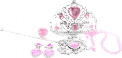 A készlet tartalmaz egy rózsaszín szívekkel díszített koronát, fülbevalókat, nyakláncot és gyűrűt, amit a kis nemes biztosan értékelni fog.
