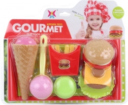 Szórakoztató műanyag ételkészlet gyerekeknek tálcával, konyhás vagy éttermes szerepjátékhoz. Tartalmaz tölcséres fagyit, fagyigombócot fagyiskanállal, makaront, hasábburgonyát és szétszedhető hamburgert egyes hozzávalókra. Ideális a képzelet fejlesztésére, a finommotorika és a közös játék támogatására.