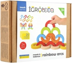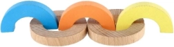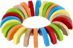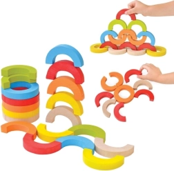 A szivárvány ívek és félkörök toronnyá, híddá vagy egyensúlyi kihívássá is rendezhetők. A gyerekek így fejlesztik koncentrációjukat, stabilitásukat és térérzékelésüket.