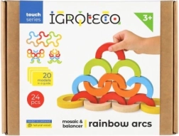 Ez a sokoldalú fa mozaik végtelen játéklehetőséget kínál – tornyok és hidak építésétől a szimmetrikus minták kirakásán át az egyensúlyozó feladatokig. A masszív, simára csiszolt, élénk színű elemek játékra csábítanak, és fejlesztik a koncentrációt valamint a szem–kéz koordinációt.