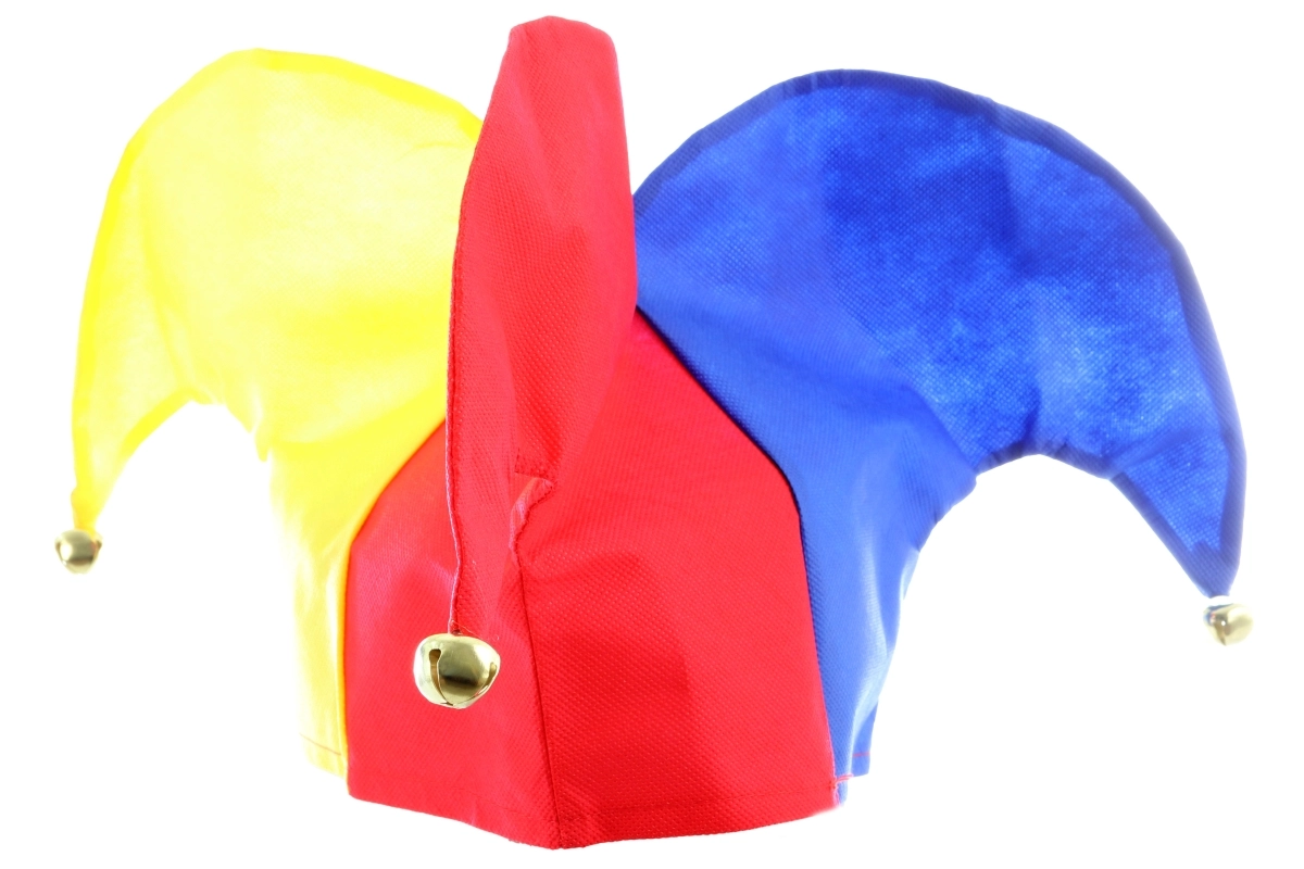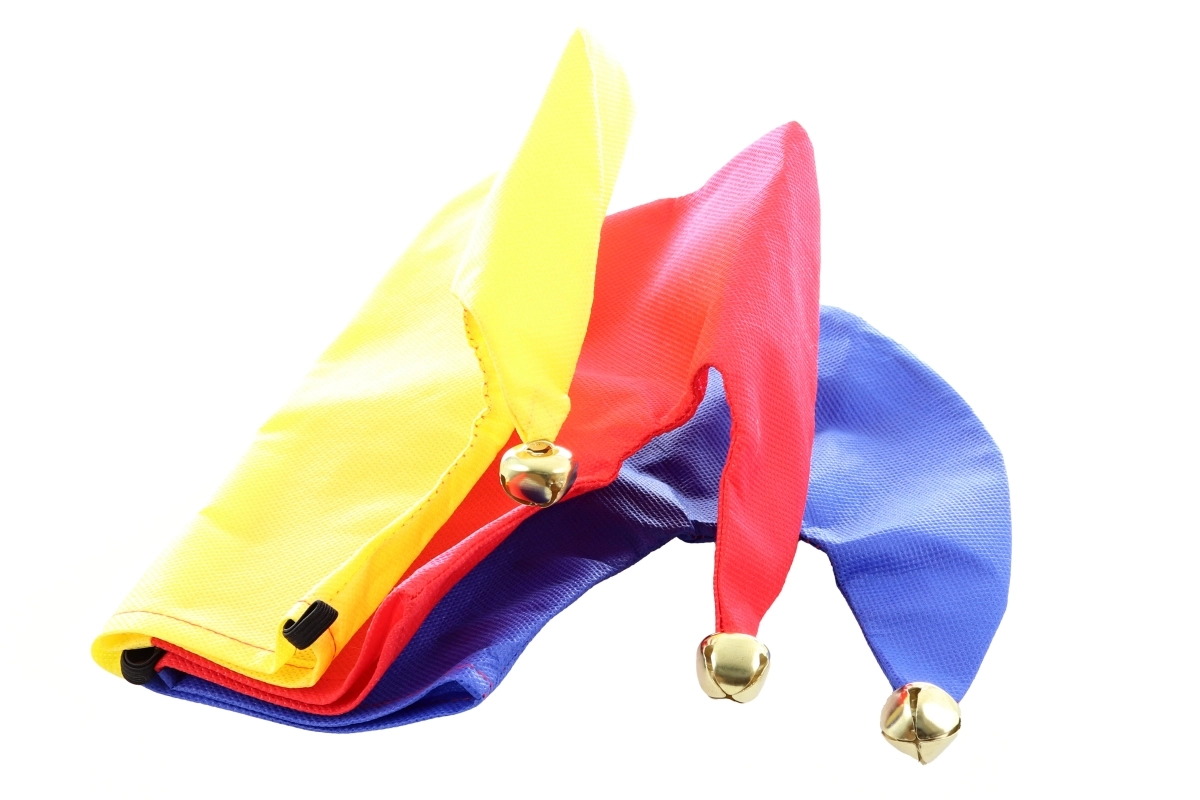 Színes bohócsapka sárga, piros és kék színekben, fém csengőkkel a játékos csilingelő hatásért minden mozdulatnál.