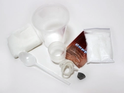 ammónium-dihidrogén-foszfát, zöld élelmiszer-színezék, főzőpohár, 2 műanyag pohárka, műanyag kanál, gyapjúfonal, papírzsebkendő, kavics, magyar nyelvű útmutató