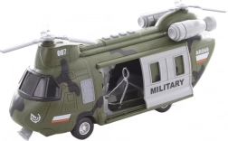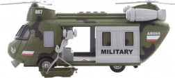A valósághű, 1:16 méretarányú katonai helikopter minden kis pilótának örömet szerez. Gombnyomásra felvillan és autentikus hangokat ad ki. A tápellátást 3× AG13/LR44 elem biztosítja, amelyek a csomag részét képezik. Ideális ajándék 3 éves kortól.