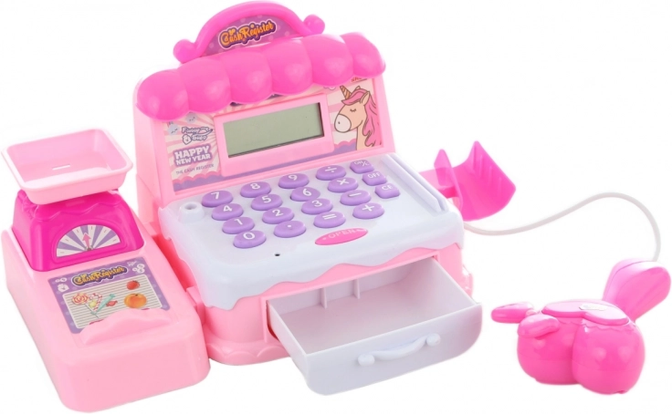 Gyermek pénztárgép unikornissal – rózsaszín, elemes elektronikus pénztárgép