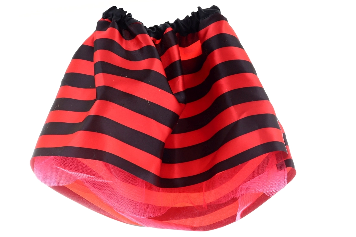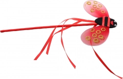 A szett részei: áttetsző rózsaszín-piros szárnyak csillámos pöttyökkel, elasztikus, piros-fekete csíkos szoknya, rugalmas csápos fejpánt és hozzáillő, szalagos pálca. A méretezés 3 éves kortól ajánlott; a csomag mérete kb. 49 × 57 cm.