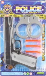 A rendőrségi készlet tartalmaz egy pisztolyt, bilincset és 3 darab tapadókorongos lövedéket. A csomag mérete kb. 31,5 x 19 x 3 cm. Ajánlott életkor: 3+