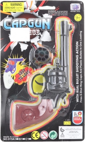 Western csattogó pisztoly 8-lövetű dobbal. Könnyű, egyszerűen használható játék az akciódús gyerekszórakozáshoz. Csomag mérete: 25,5 × 15 × 3,5 cm.