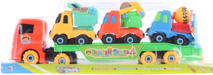 Csavarozható kamion három építőautóval. Tartós műanyag, fejleszti a motorikát és a kreativitást. A kamion mérete 39×9×7 cm. Ideális 3 éves kortól.